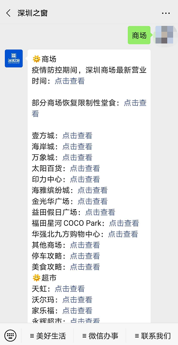 微信搜索【深圳之窗】公众号,对话框回复关键词【购物】,即可获取更多有关深圳各大购物广场、商场、超市的信息,回复购物广场名称,可获取购物广场购物攻略、优惠信息、停车信息等。