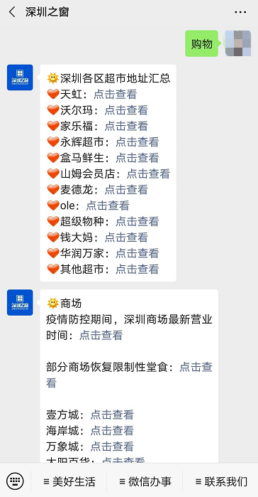微信搜索【深圳之窗】公众号,对话框回复关键词【购物】,即可获取更多有关深圳各大购物广场、商场、超市的信息,回复购物广场名称,可获取购物广场购物攻略、优惠信息、停车信息等;回复品牌名称,可获取该品牌在深圳的门店地址汇总。